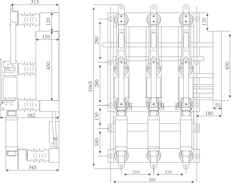 FN16A型戶內(nèi)交流高壓真空負(fù)荷開關(guān)是我廠自行設(shè)計(jì)研制而成的,性能達(dá)到GB3804-90《3-63kV交流高壓負(fù)荷開關(guān)》和IEC420《交流高壓負(fù)荷開關(guān)熔斷器組合電器》(1990年版)國際標(biāo)準(zhǔn)及國家標(biāo)準(zhǔn)(報(bào)批稿)的要求。該開關(guān)廣泛應(yīng)用于交流50/60Hz,額定電壓6-24kV的電網(wǎng)中。可有效開斷負(fù)荷電流,其熔斷 器組合電器可開斷過載電流和短路電流。具有體積小、外形美觀、安裝靈活、操作力小、開斷安全可靠、電壽命長、可頻繁每操作、開斷轉(zhuǎn)移電流大、基本 不需要維護(hù),有明顯的各里斷口且具有手、電動(dòng)二用功能,可實(shí)現(xiàn)遠(yuǎn)距離控制等優(yōu)點(diǎn)。 負(fù)荷開關(guān)-熔斷器組合電器還具有保護(hù)變壓器過載,防止設(shè)備缺相運(yùn)行的功能。